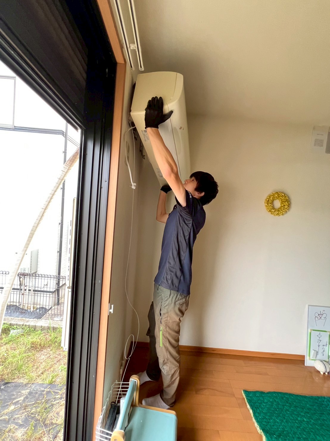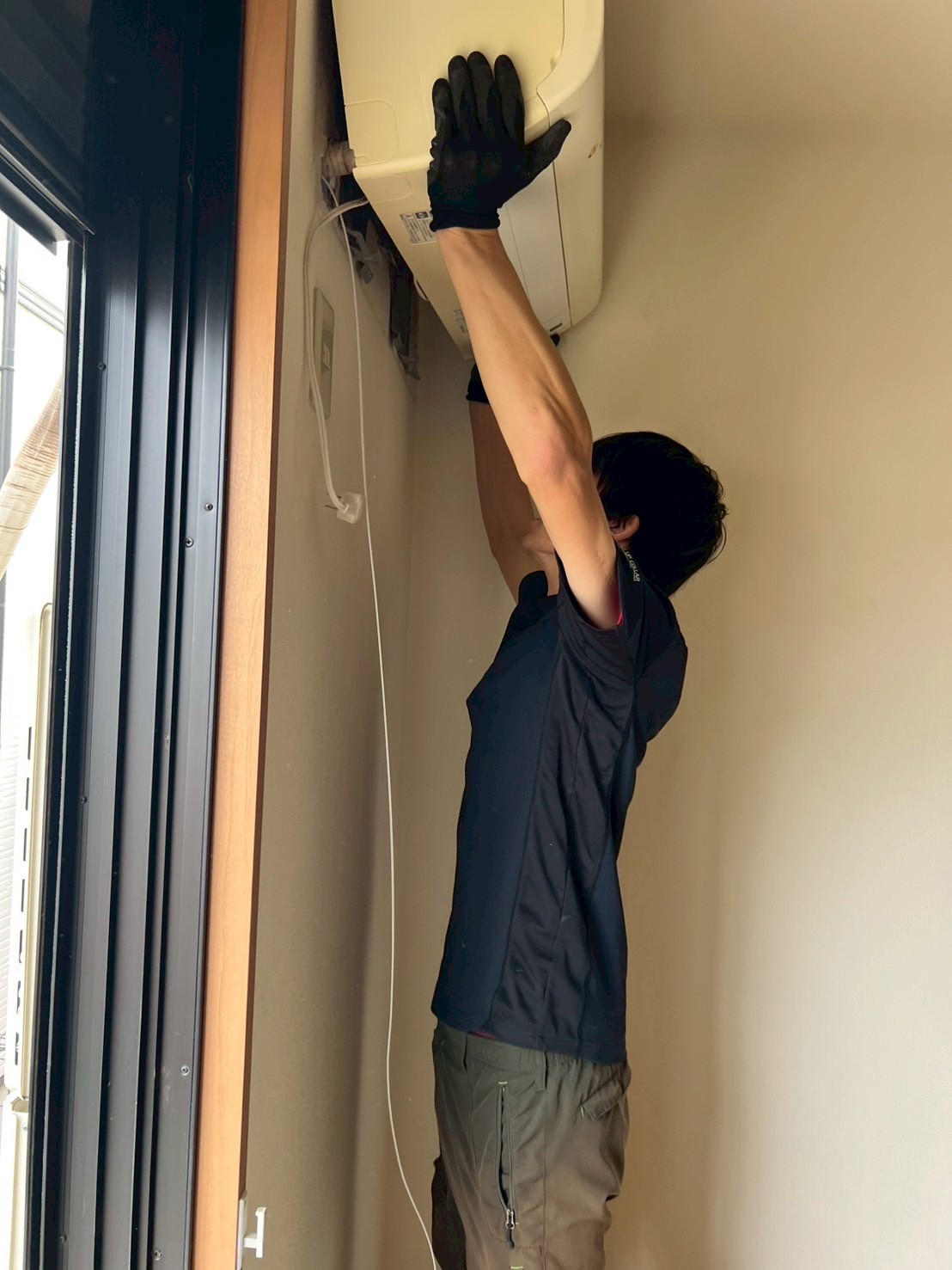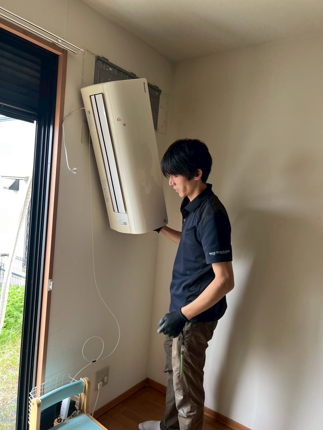壁に取り付けられている室内機を慎重に取り外しにかかります。この時、配線や配管がまだ繋がっているため、無理な力を加えないよう細心の注意を払います。高い位置での作業となりますが、お客様のお部屋を傷つけないよう丁寧に取り外しました。