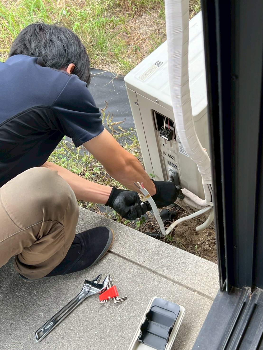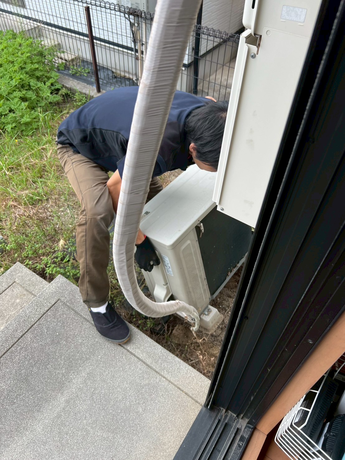 室外機の接続部分を慎重に外し、配管を保護しながら丁寧に作業を進めます。配線類も安全に切断・処理を行いました。作業スペースは限られていましたが、工具を使い、しっかり腰を落として作業に集中している様子です。