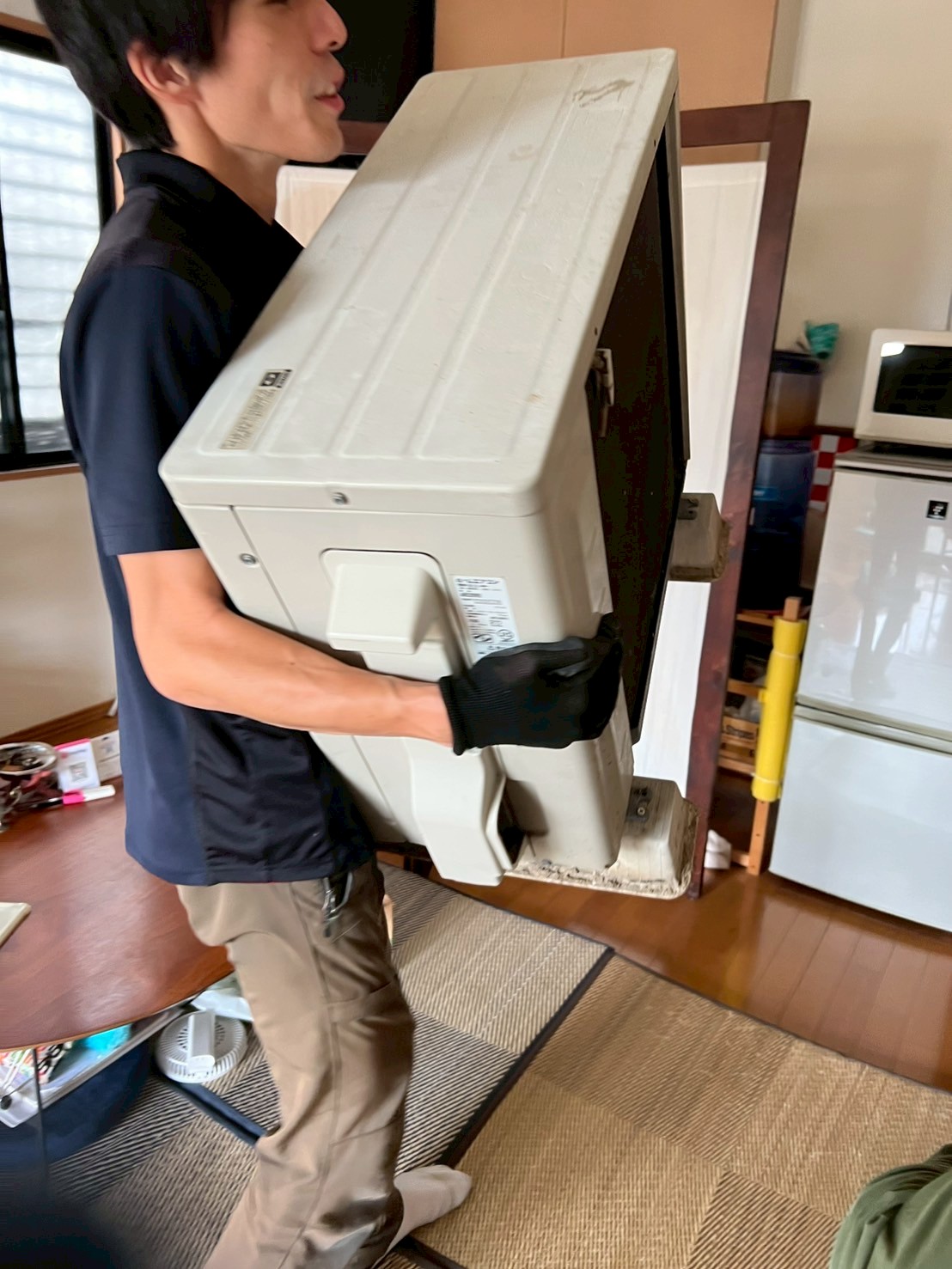 (写真3) 室内機が完全に外れた後、運搬しやすいよう抱えて持ち運びます。作業はあっという間の20分〜30分程度で完了いたしました。